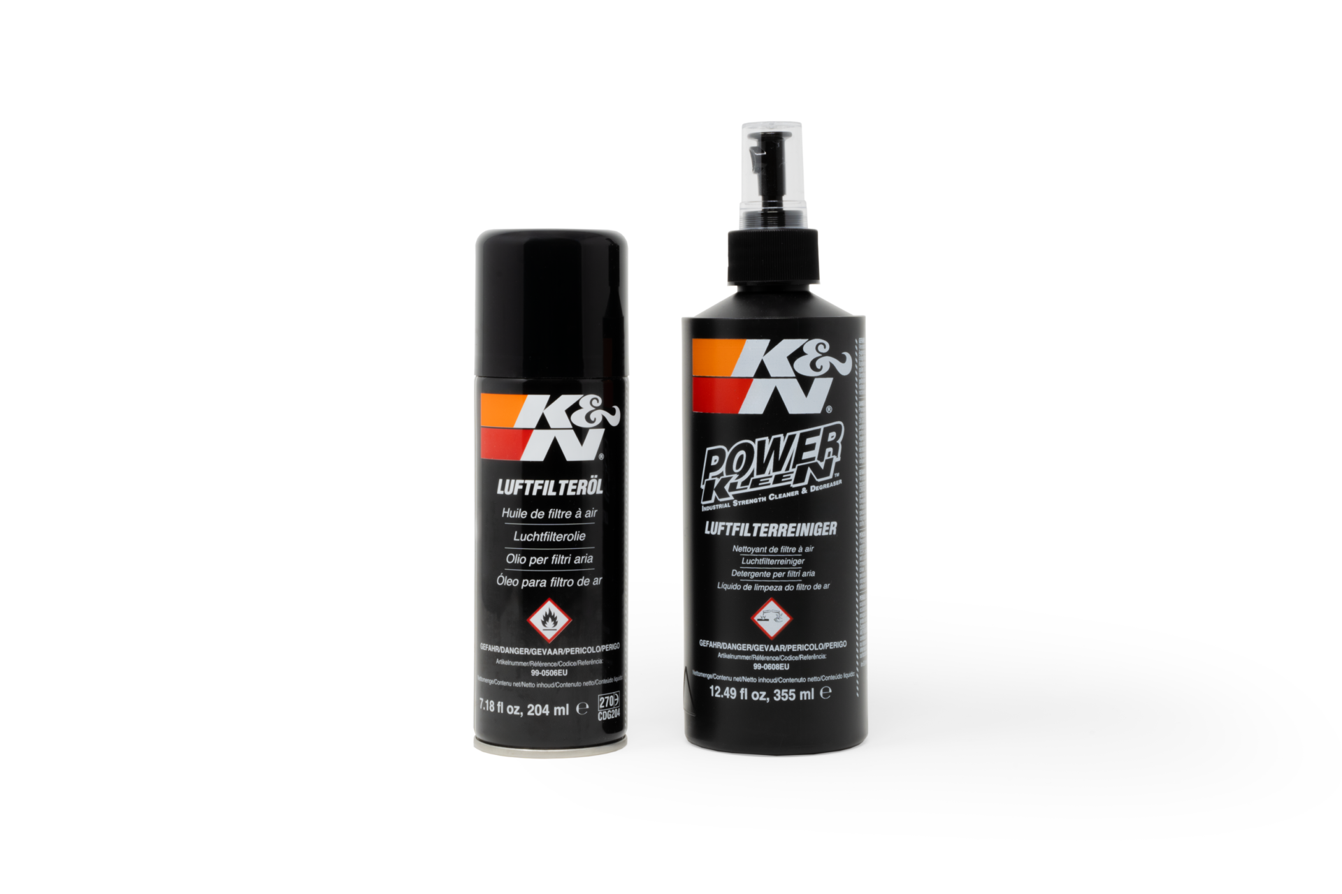 Das Kit wird mit einer 204ml Sprühdose Öl und einer 355ml Pumpflasche K&N “Power Kleen” Luftfilterreiniger geliefert.